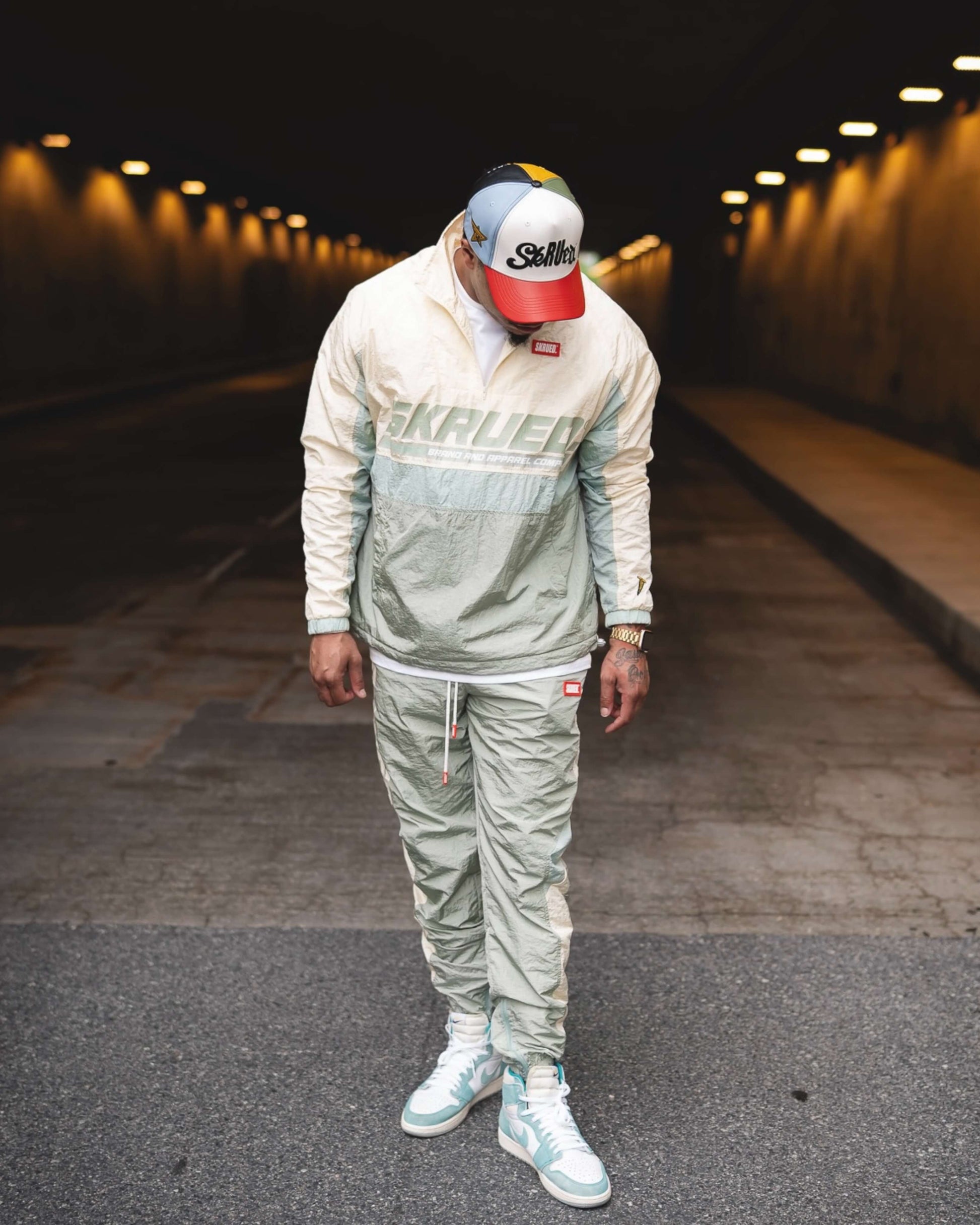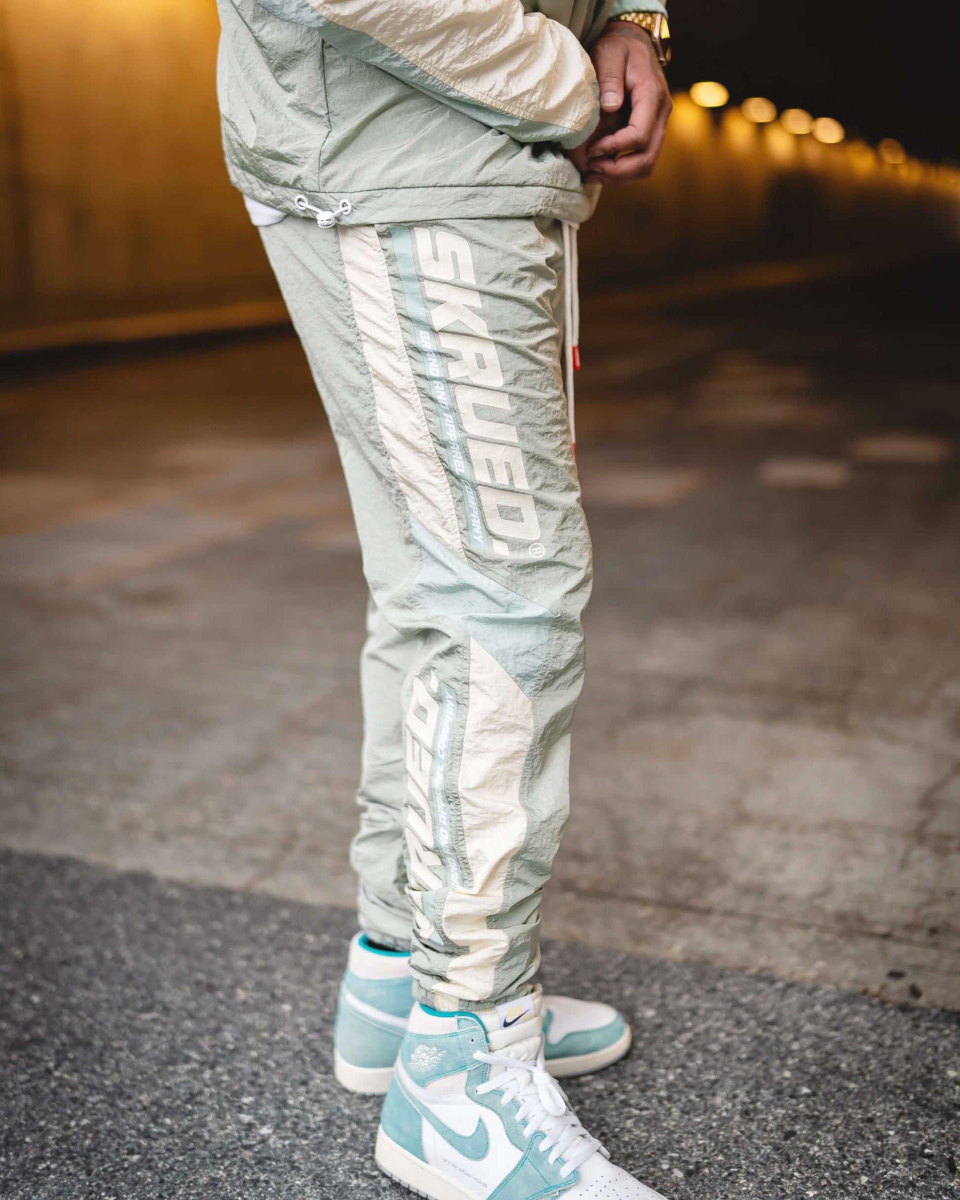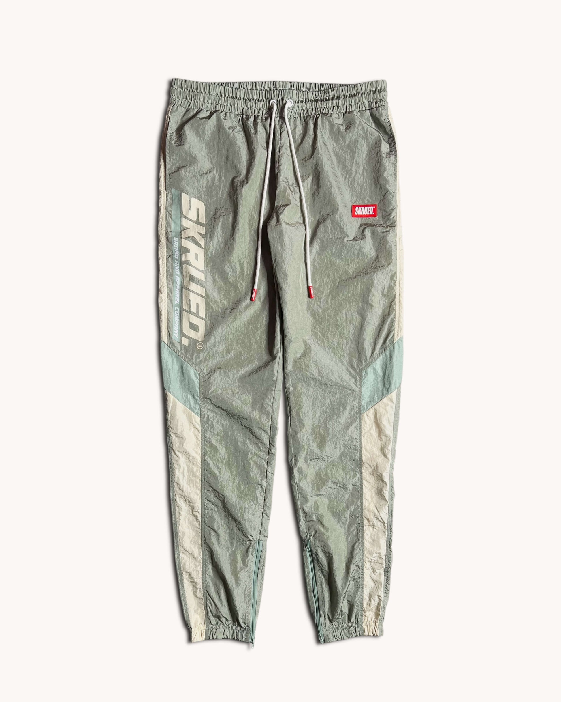 Crushed nylon track pants with vintage style panel construction. Pants feature brand bar logo front and back prints with zipper closer bottom leg openings. Inside is lined with cotton fabric insulation.