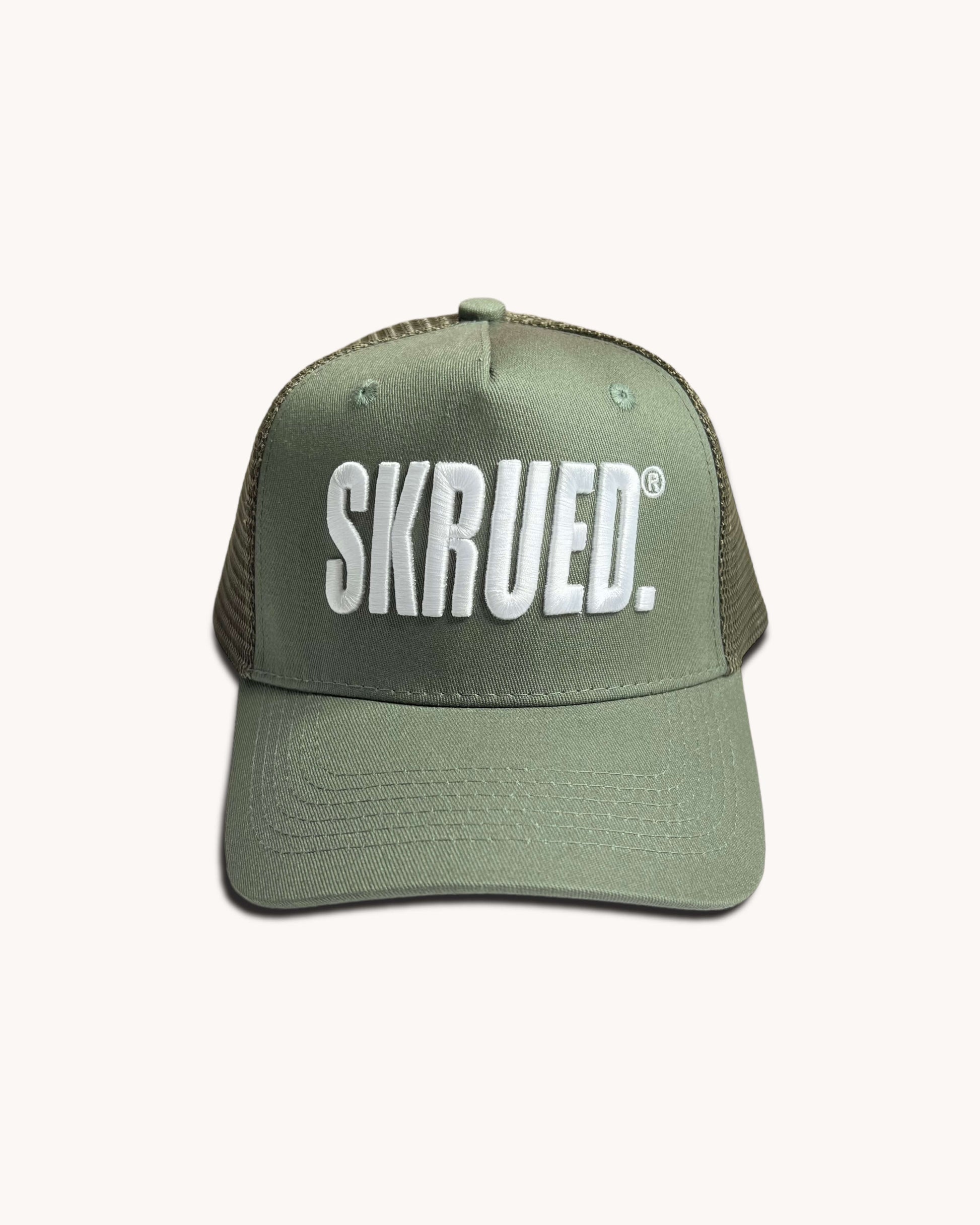 Trucker style hat with 3D embroidered Classic SKRUED logo.