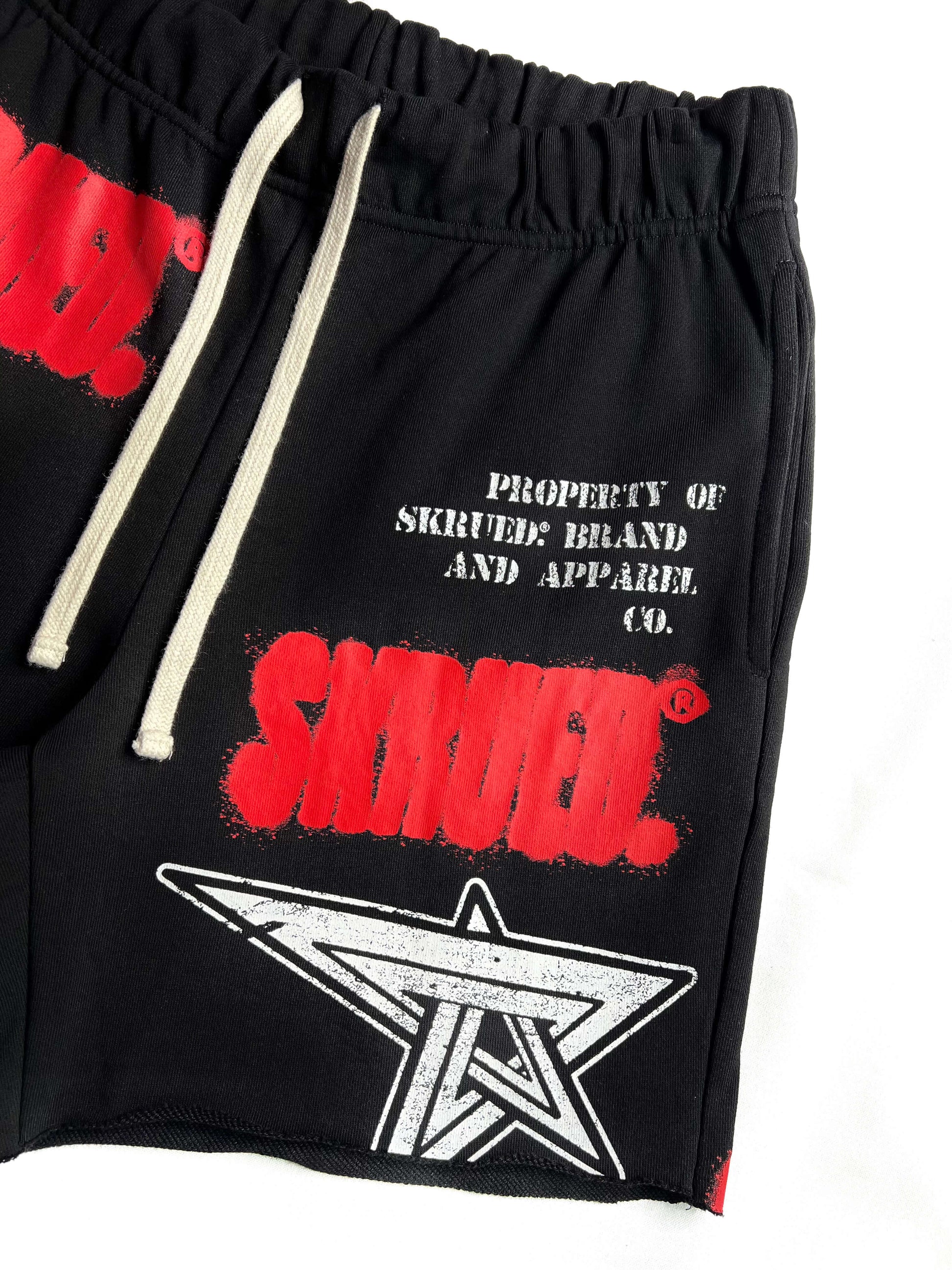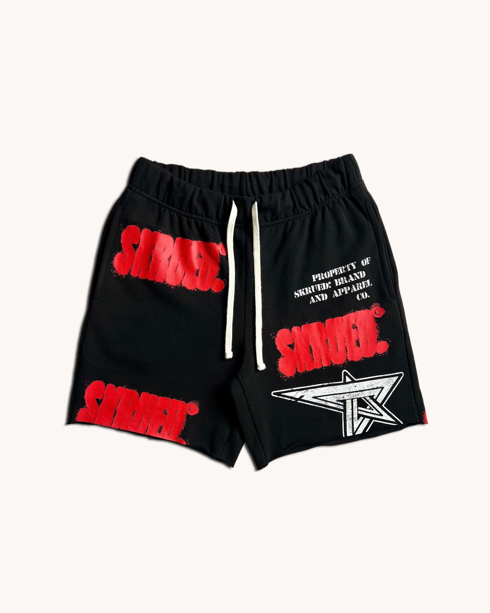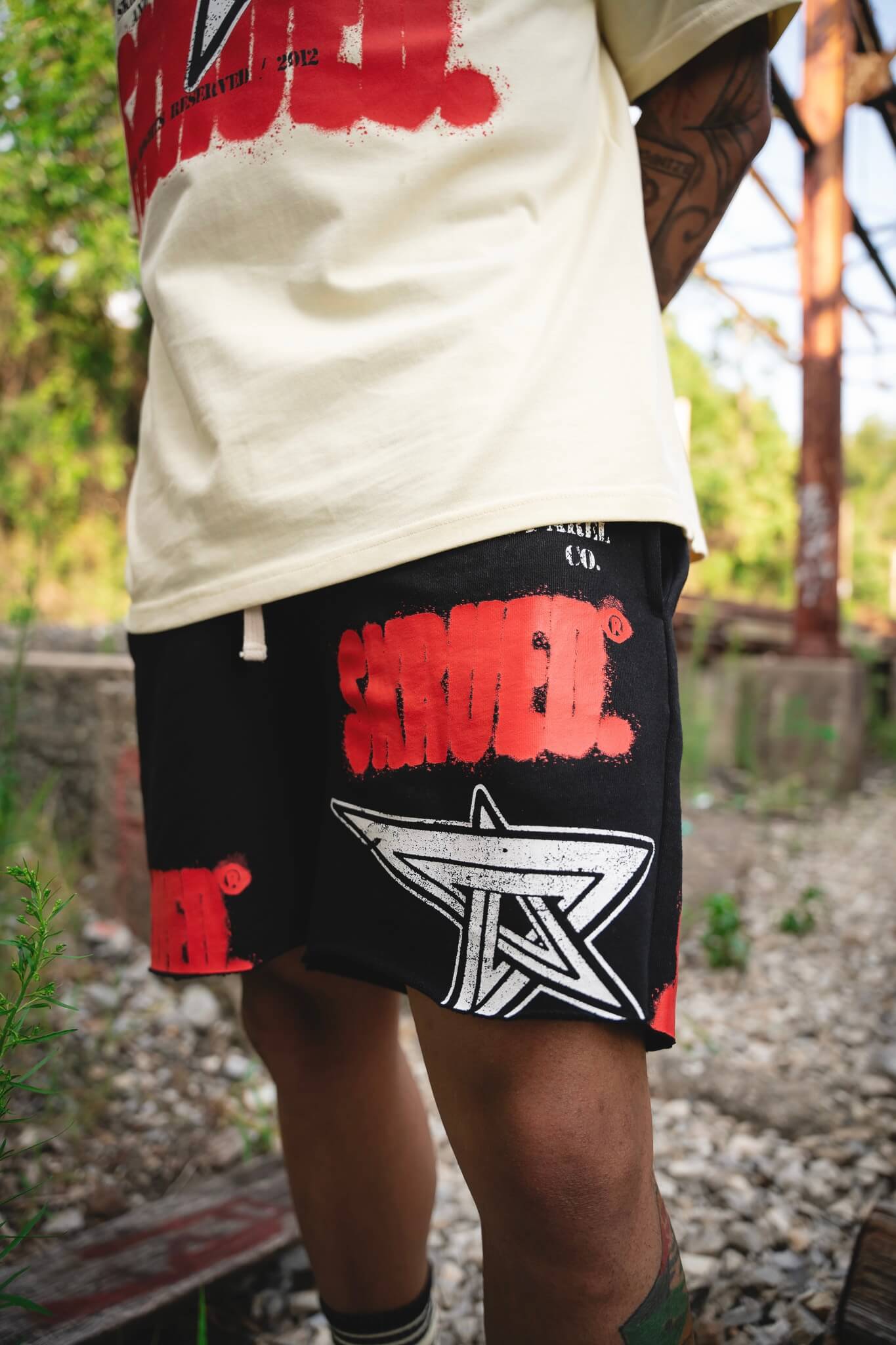 Heavyweight french terry cotton shorts with front Energy Star logo print. Raw hem construction compliments the edgy graffiti style Classic logos printed on the front and back.