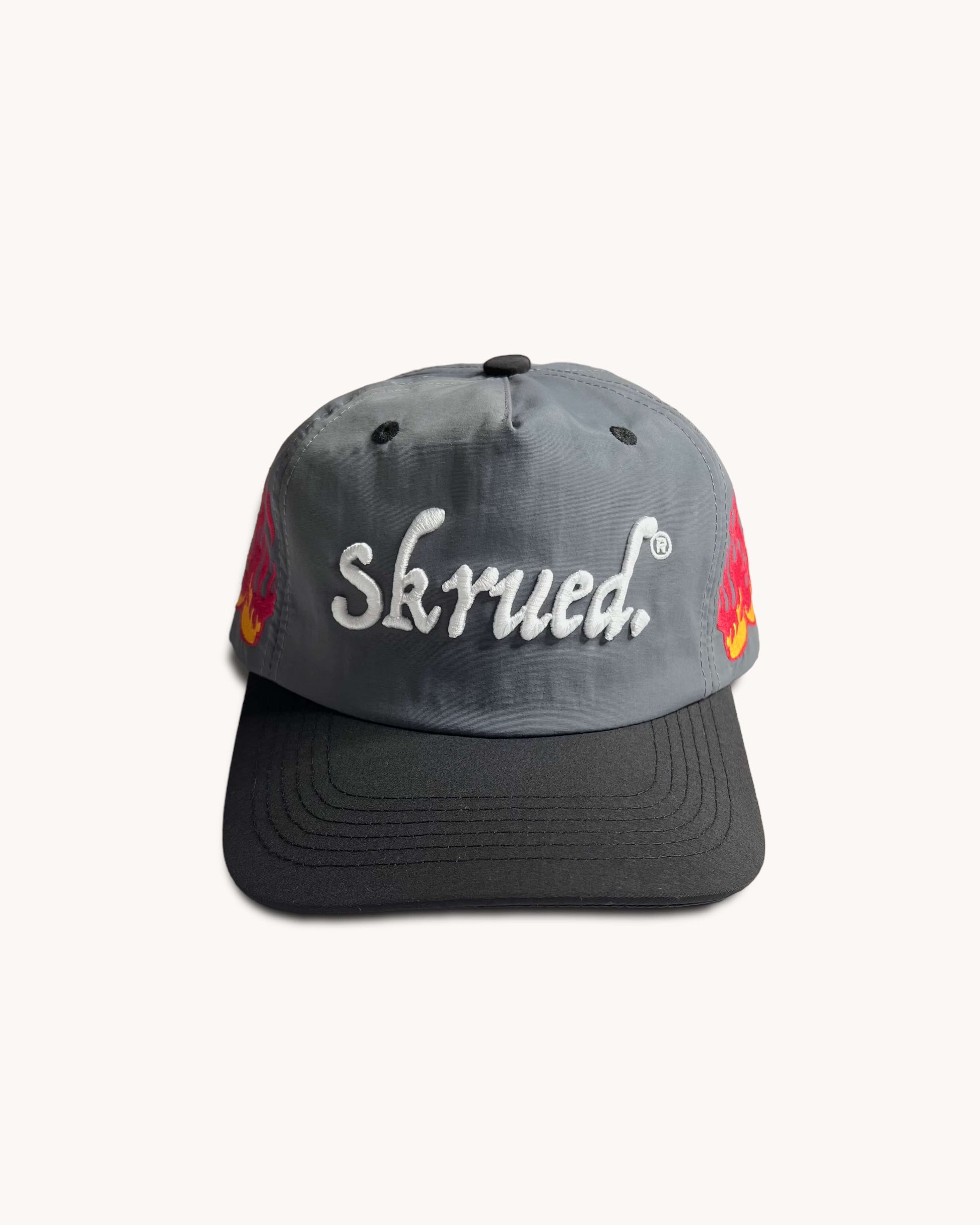 Introducing our nylon fabric hat with detailed flame embroidery on both sides. Snapback closure on the back with logo box tag for size adjustment . Front SKRUED logo in 3D embroidery.