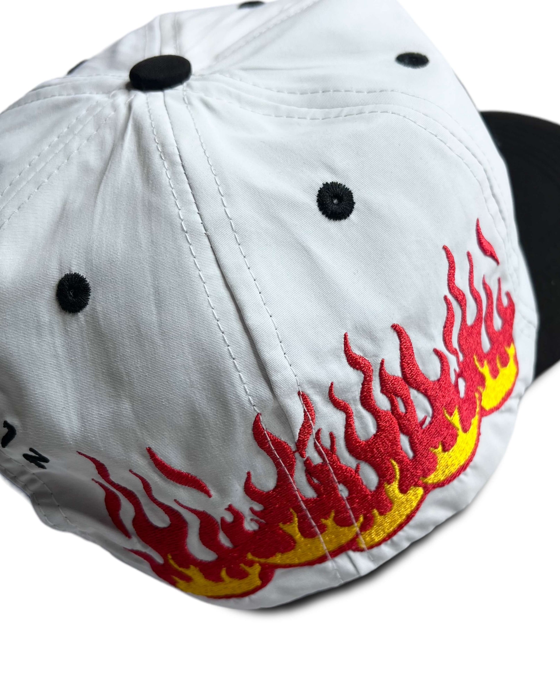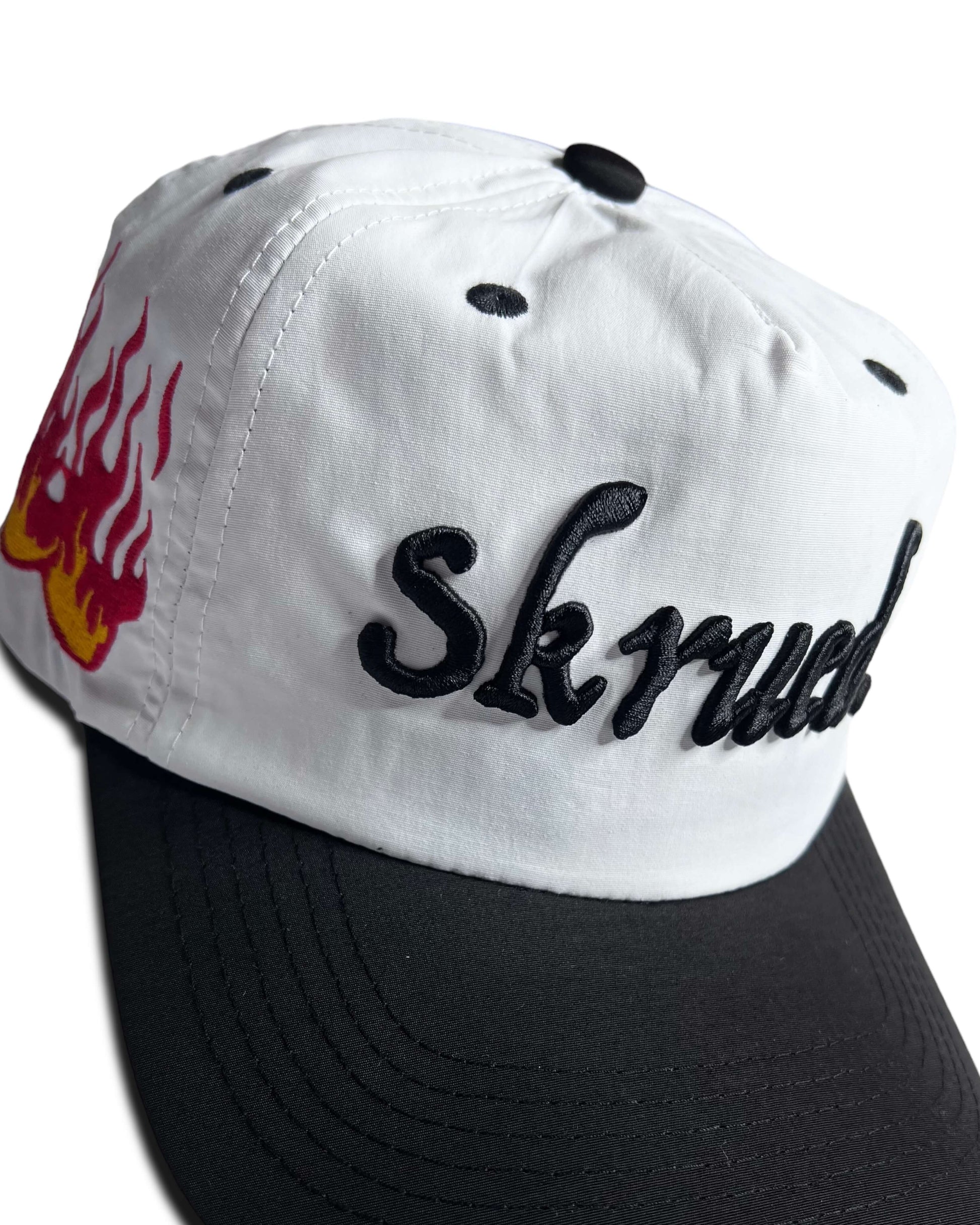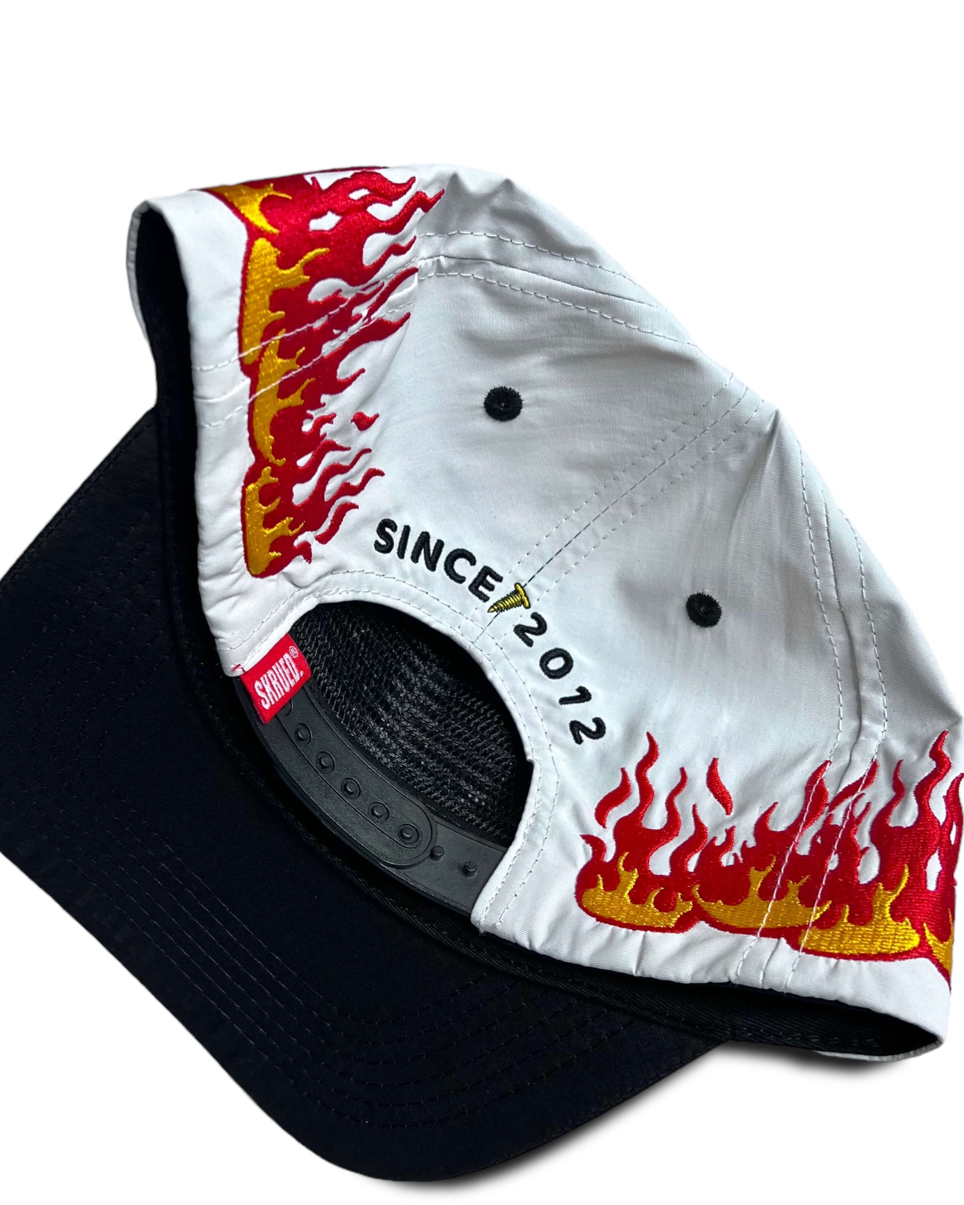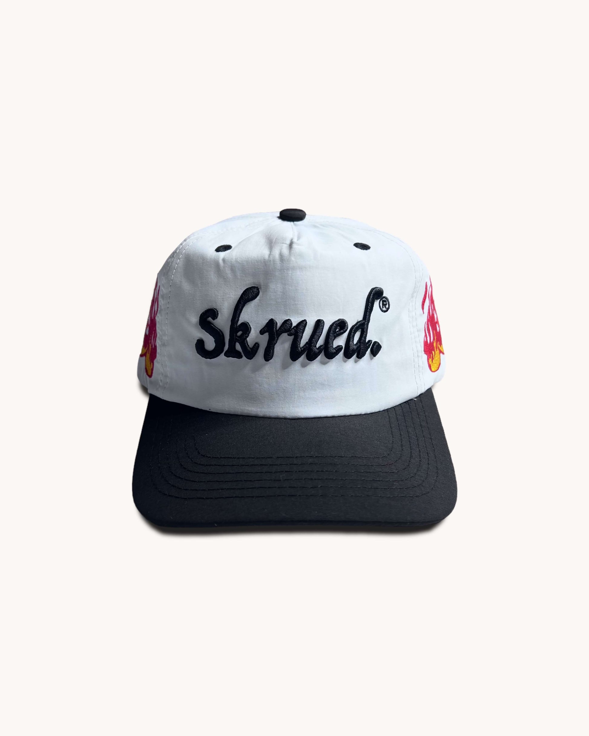 Introducing our nylon fabric hat with detailed flame embroidery on both sides. Snapback closure on the back with logo box tag for size adjustment . Front SKRUED logo in 3D embroidery.