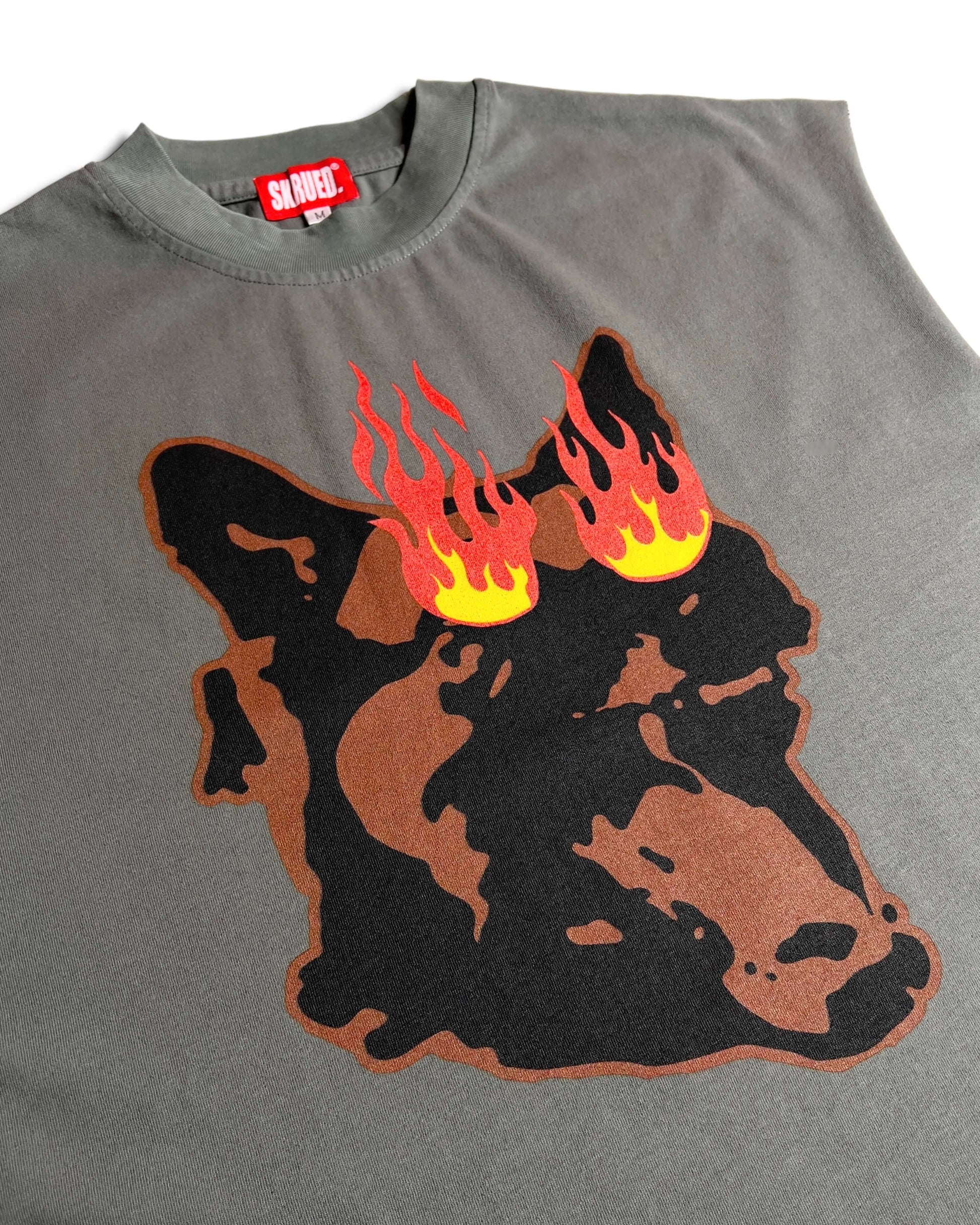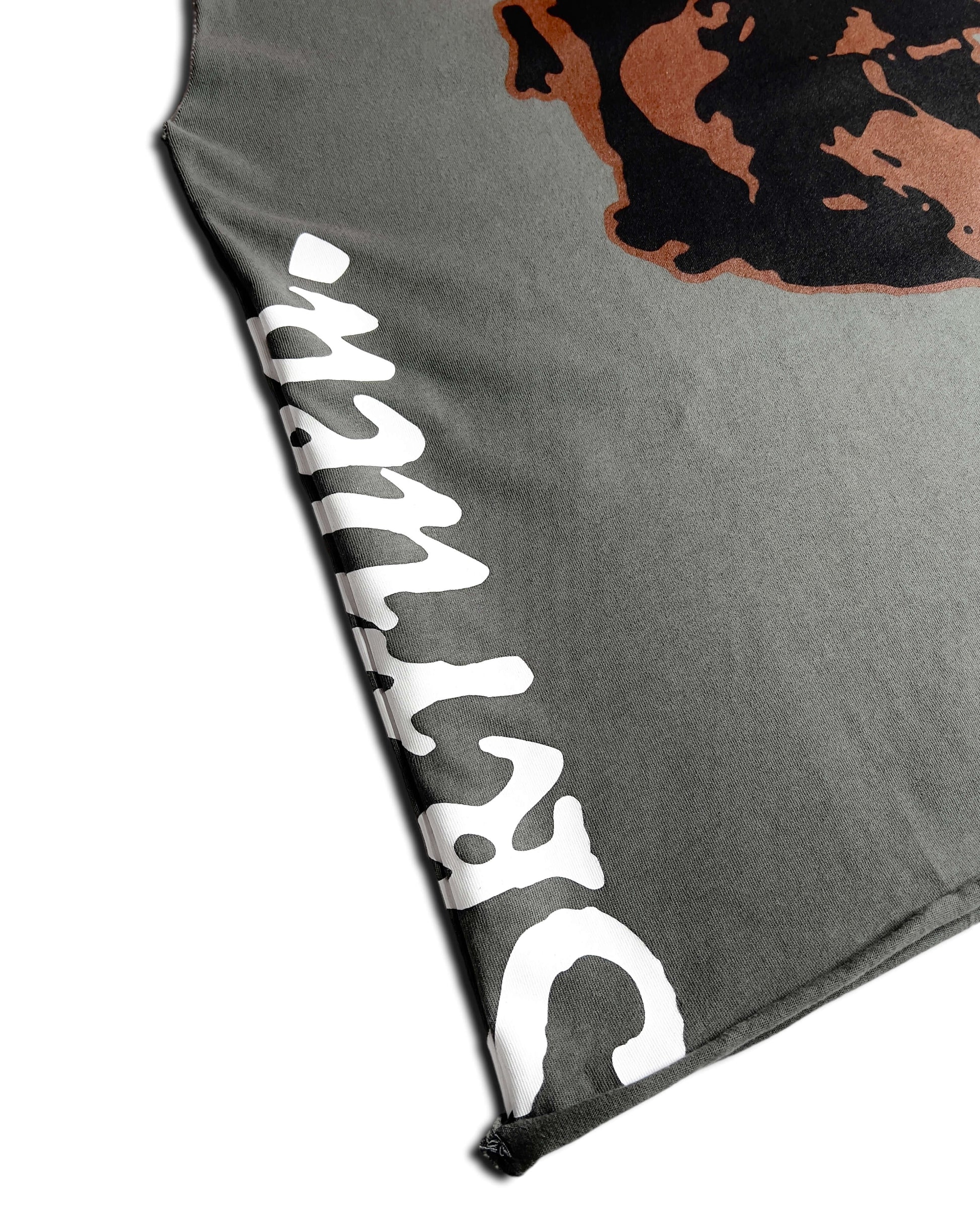 Heavyweight cotton tee with Mad Dawg graphic and side seam prints. The cutoff sleeve construction with raw hem adds a stylish vintage look and feel.
