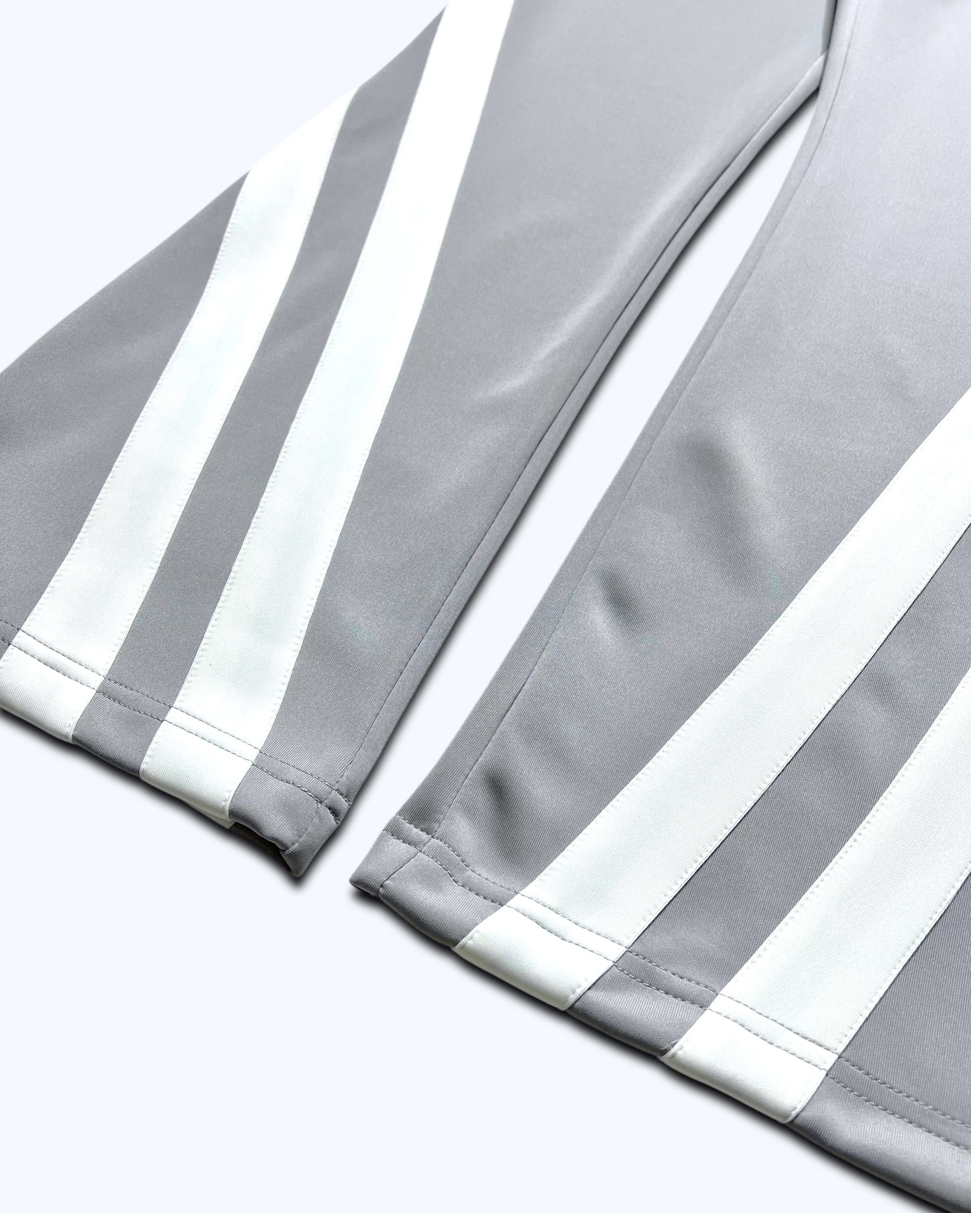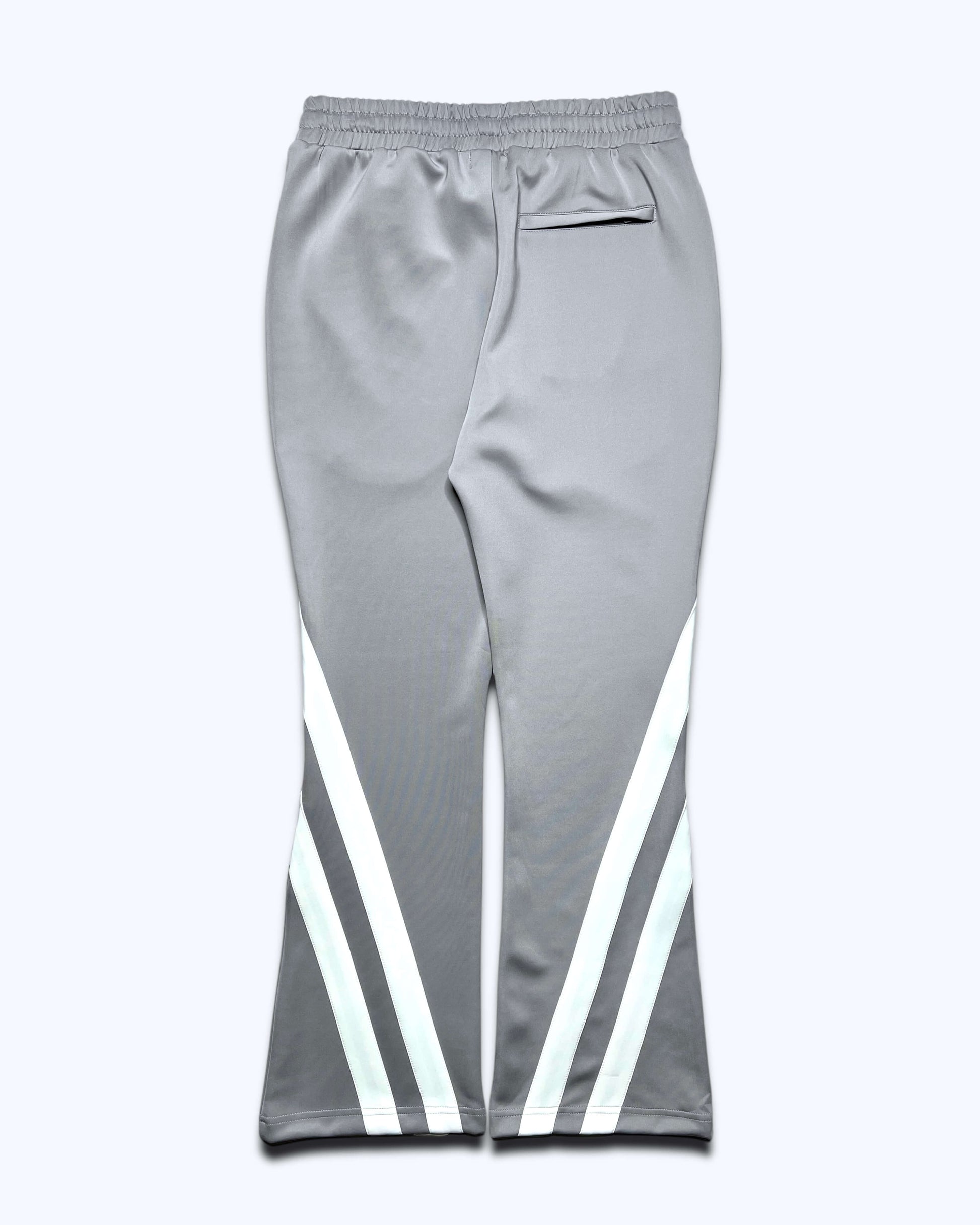 Designed for movement, built for presence! These track pants fuse athletic comfort with elevated style, featuring a sleek flare bottom that sets them apart from the standard silhouette. Slanted stripes run along the front and back, giving the pants a dynamic edge that mirrors forward motion. Whether you're chasing greatness on the move or standing tall in your environment, these track pants will keep you stylish and ready for wherever the pursuit takes you!