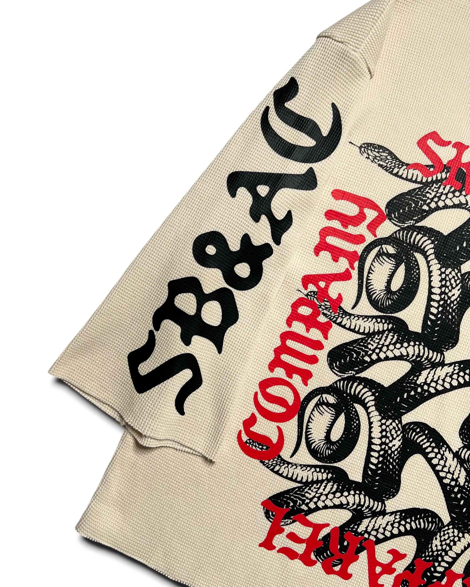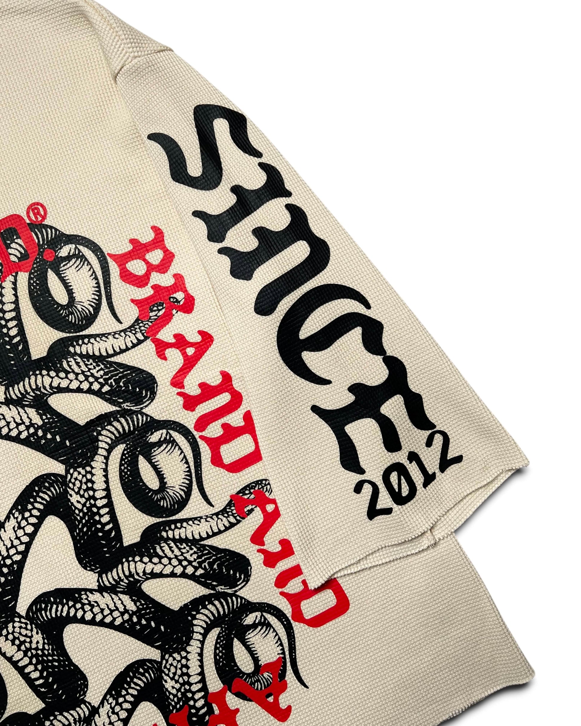 This oversized thermal was designed for those who know every environment won’t be safe. Featuring a bold snake graphic print, raw hem finish, and raw three-quarter sleeves, it carries an edge that reflects the reality of navigating through untrustworthy energy and hidden intentions. The comfortable yet rugged look is a reminder that growth often comes in difficult places, yet this is what molds you to become unstoppable as you continue to elevate up out of any pit!