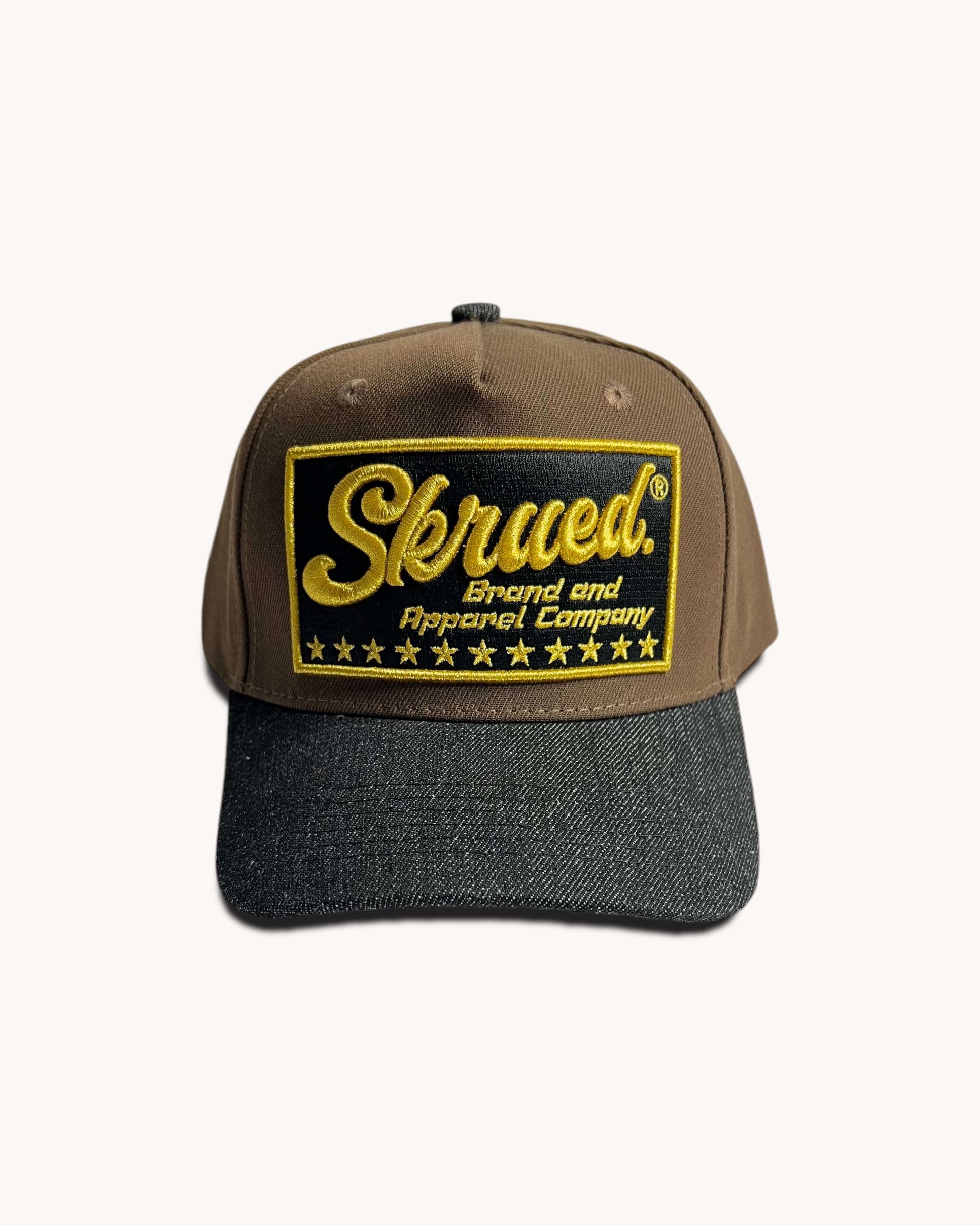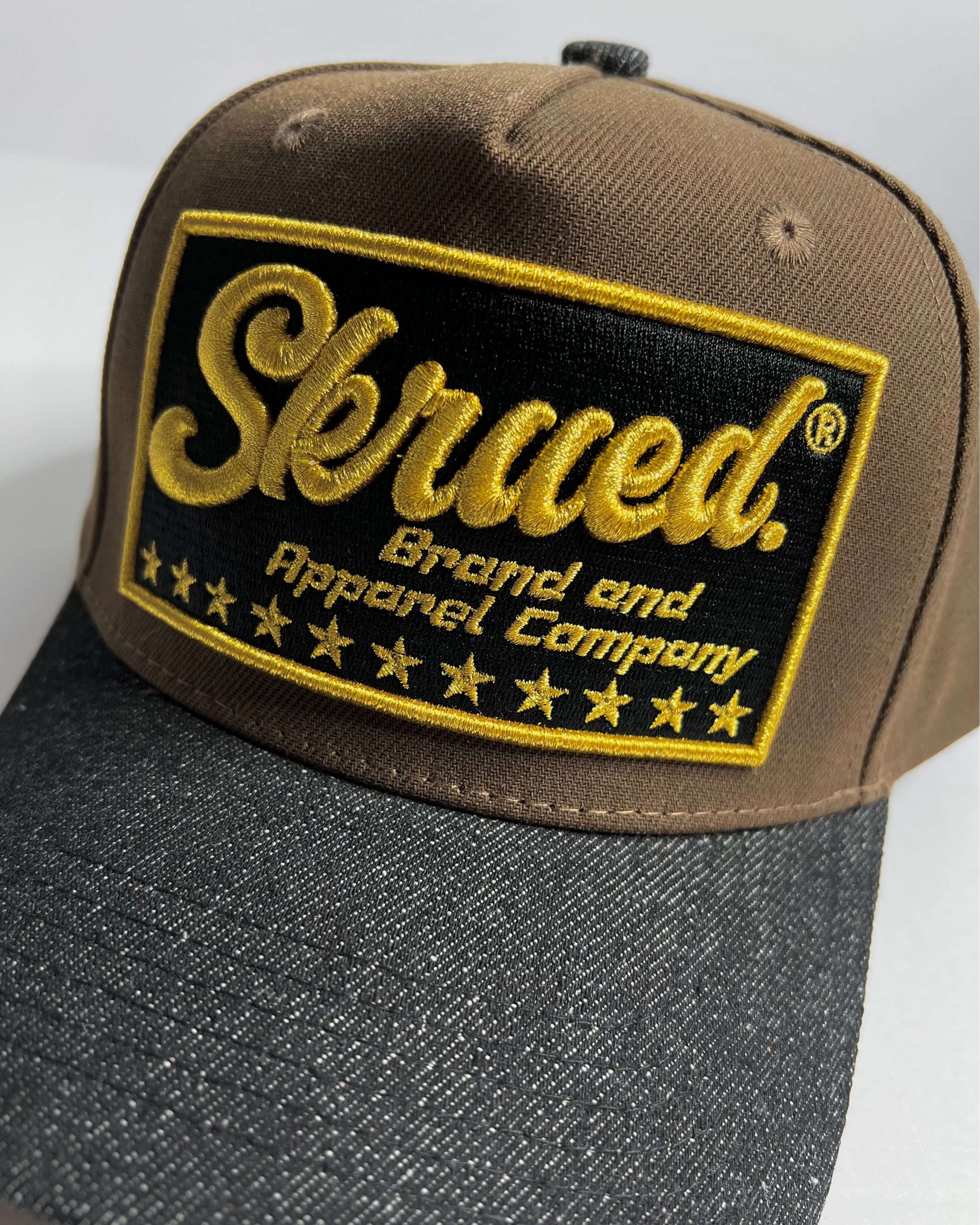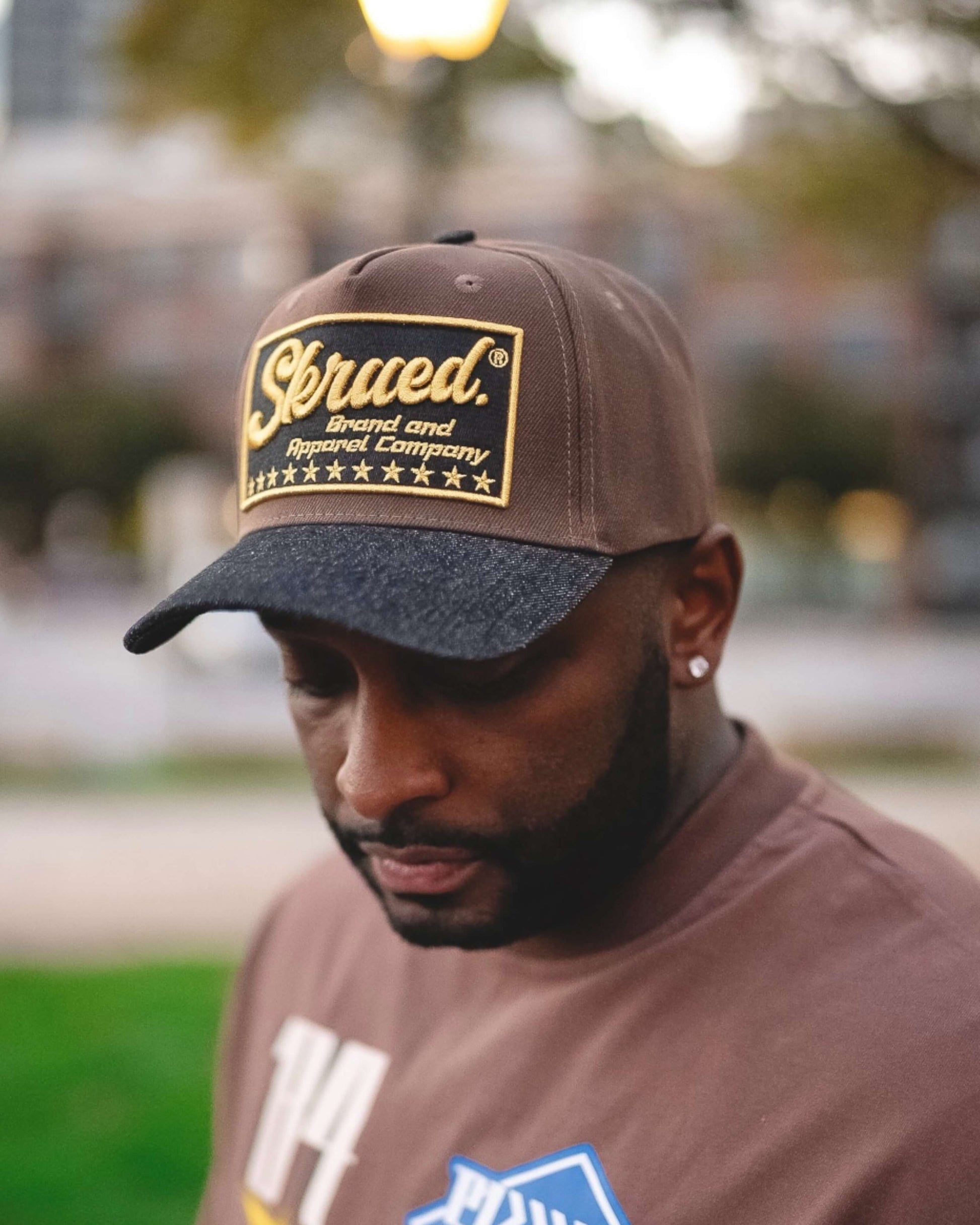 Snapback hat with front Star Patch 3D embroidery and denim brim.